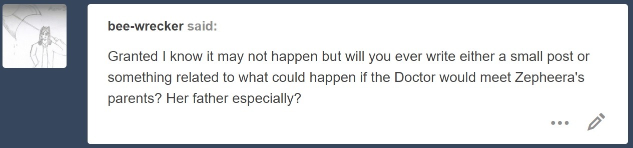 The Doctor shot a dire look toward his human companion and the woman in his hand. “…Spoilers,” he muttered, lifting Zepheera to his shoulder.